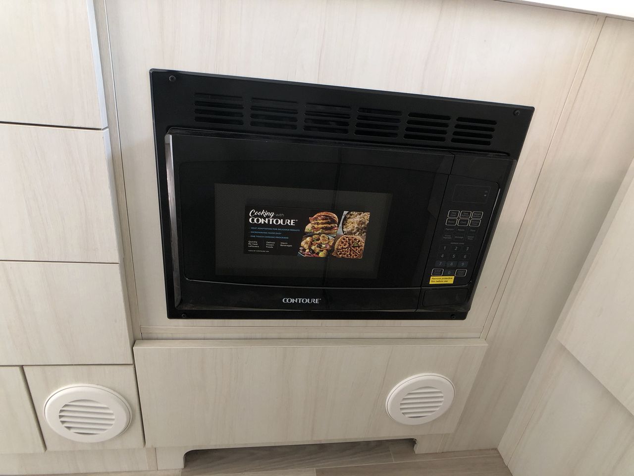 The living area is designed for relaxation and entertainment, complete with a multi-purpose dinette that can seat up to four people. This space easily converts into an additional sleeping area if needed. The kitchenette is equipped with modern appliances, including a two-burner stove, a microwave, and a refrigerator, making meal prep a breeze.