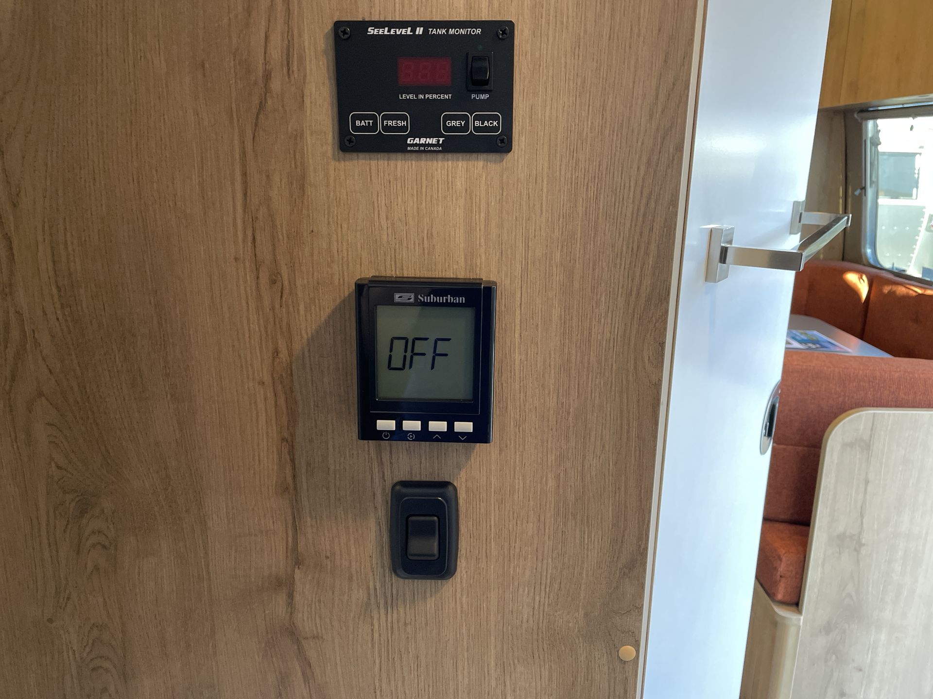The rear bathroom is both practical and stylish, featuring a reeded glass shower door, removable handheld shower head, and a retractable clothesline for added convenience. A recirculating water heater ensures efficient water usage during your travels.