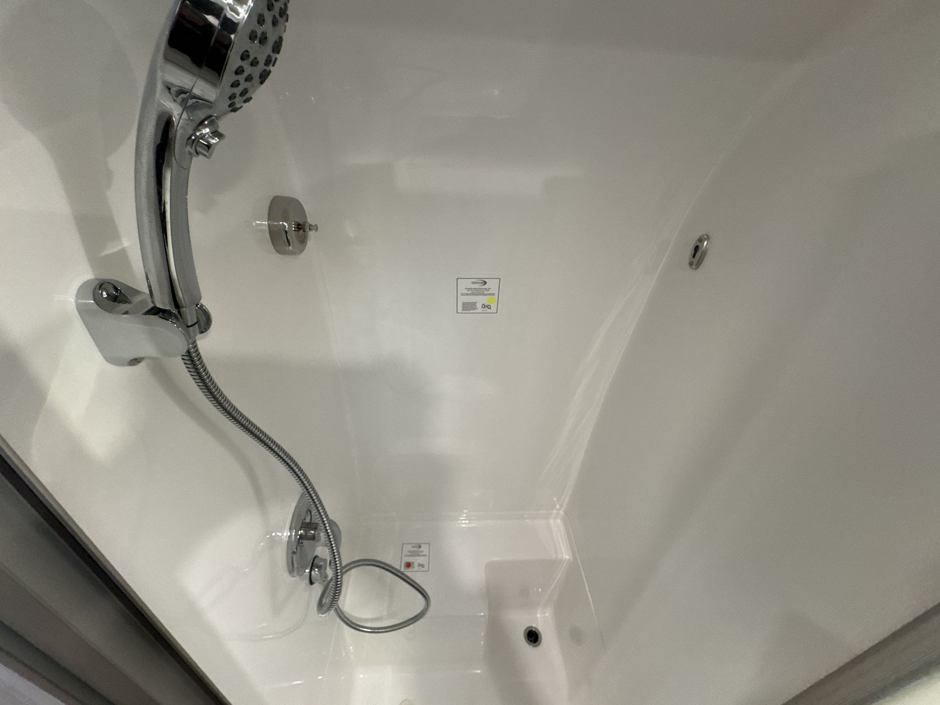 Comfort is a priority, with an efficient climate control system featuring both heating and air conditioning to maintain the perfect temperature year-round. The spacious bathroom includes a separate shower, toilet, and vanity, providing the conveniences of home on the road.