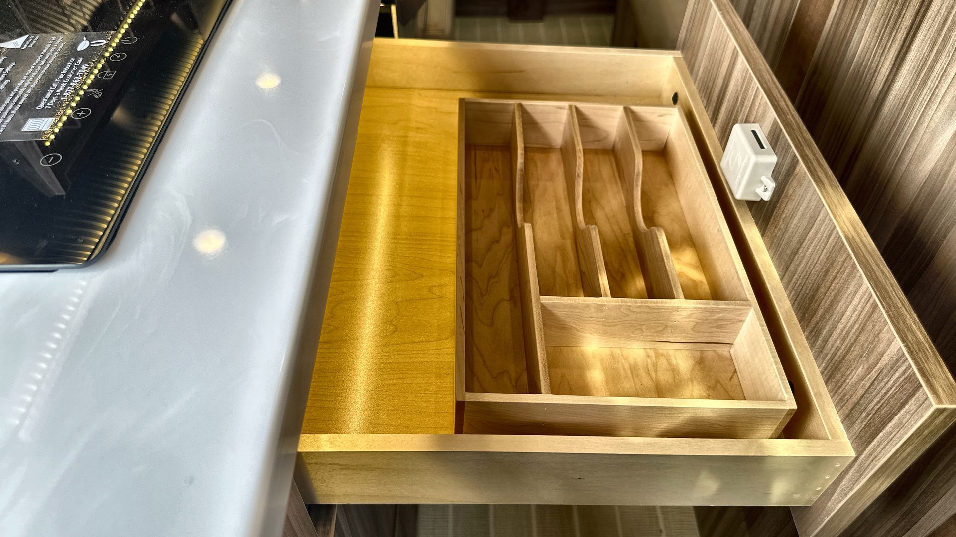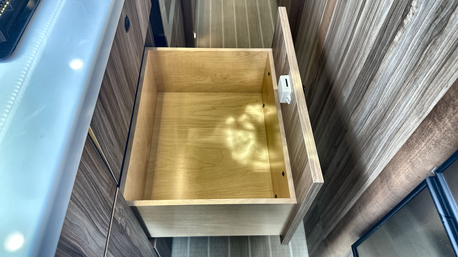 The European-style wet bath is designed for efficiency, featuring a shower, toilet, and sink in one versatile space. Additional amenities include a built-in bar cabinet for storing wine and spirits, power day/night window shades, and an LED widescreen HDTV for entertainment.
