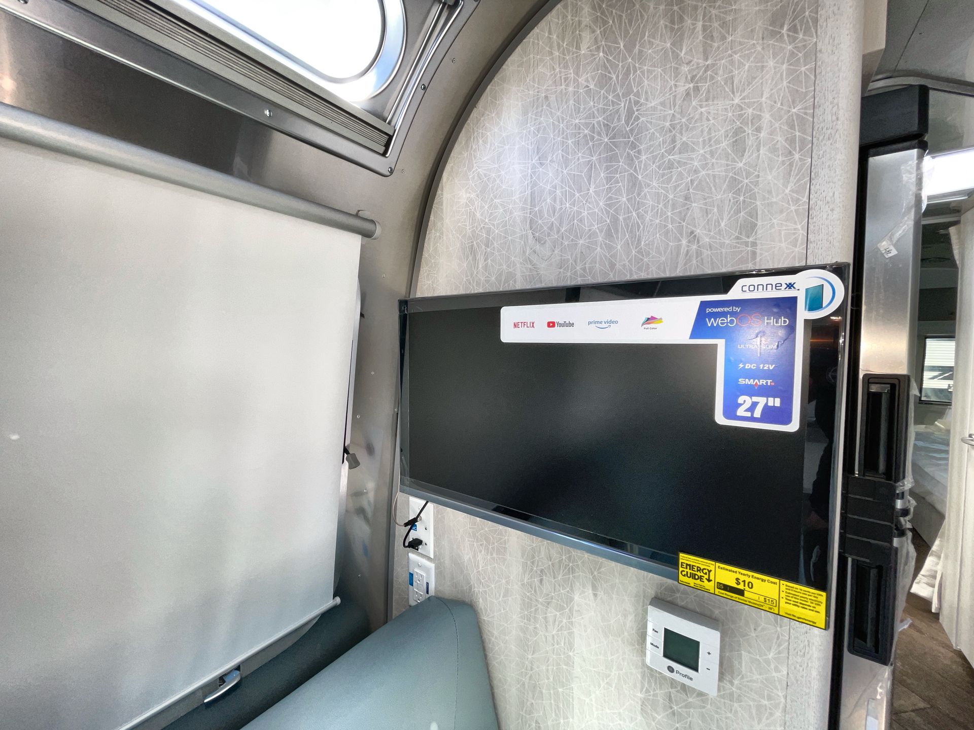 The 2024 Airstream International 27FB Twin is a 28-foot travel trailer designed for comfort and convenience. Its aluminum exterior enhances durability and fuel efficiency. Inside, the front bedroom features twin beds with under-bed storage and a wardrobe with a hanging bar. The kitchen includes a three-burner stove, oven, microwave, and an 8 cu. ft. refrigerator, along with ample cabinetry and counter space. The dinette comfortably seats four and converts into additional sleeping space. The bathroom is split, with a toilet and vanity on one side and a separate shower across the hall. Panoramic windows provide natural light and scenic views. Additional features include a climate control system, LED lighting, and a sound system with Bluetooth® connectivity. The 27FB Twin offers a comfortable and functional space for travelers.