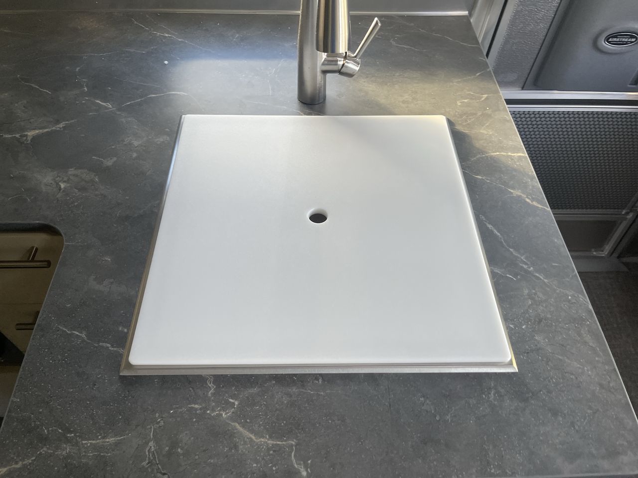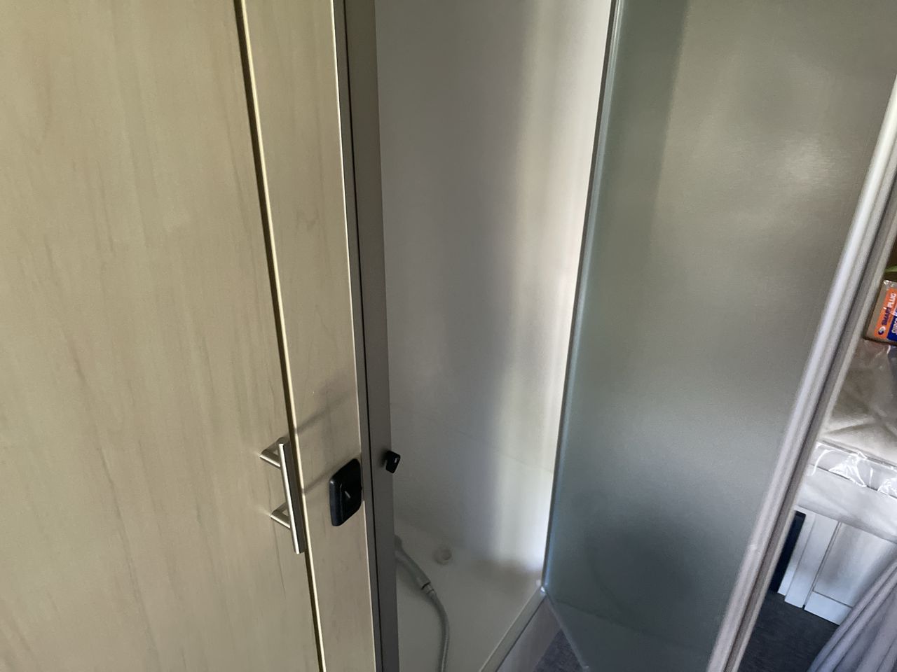 The bathroom is designed with privacy and functionality in mind. It features a separate shower, toilet, and sink area, ensuring comfort during your travels. Additional storage in the bathroom helps keep essentials within reach.