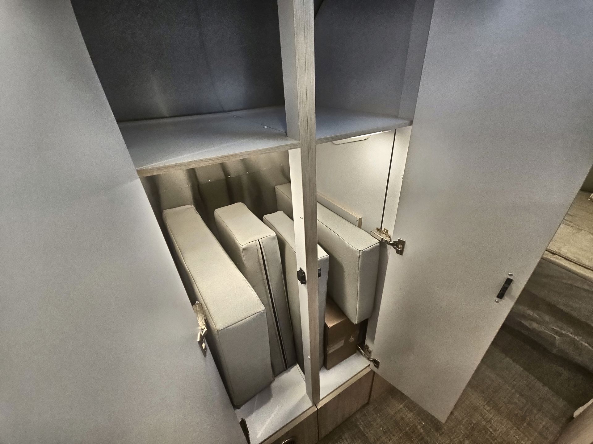 At the rear, the bedroom features a comfortable queen-size bed with plush bedding. Surrounding storage options, such as overhead compartments and spacious wardrobes, provide ample space for your belongings. Large windows allow natural light to fill the room, creating a peaceful setting for rest after a day of adventure.