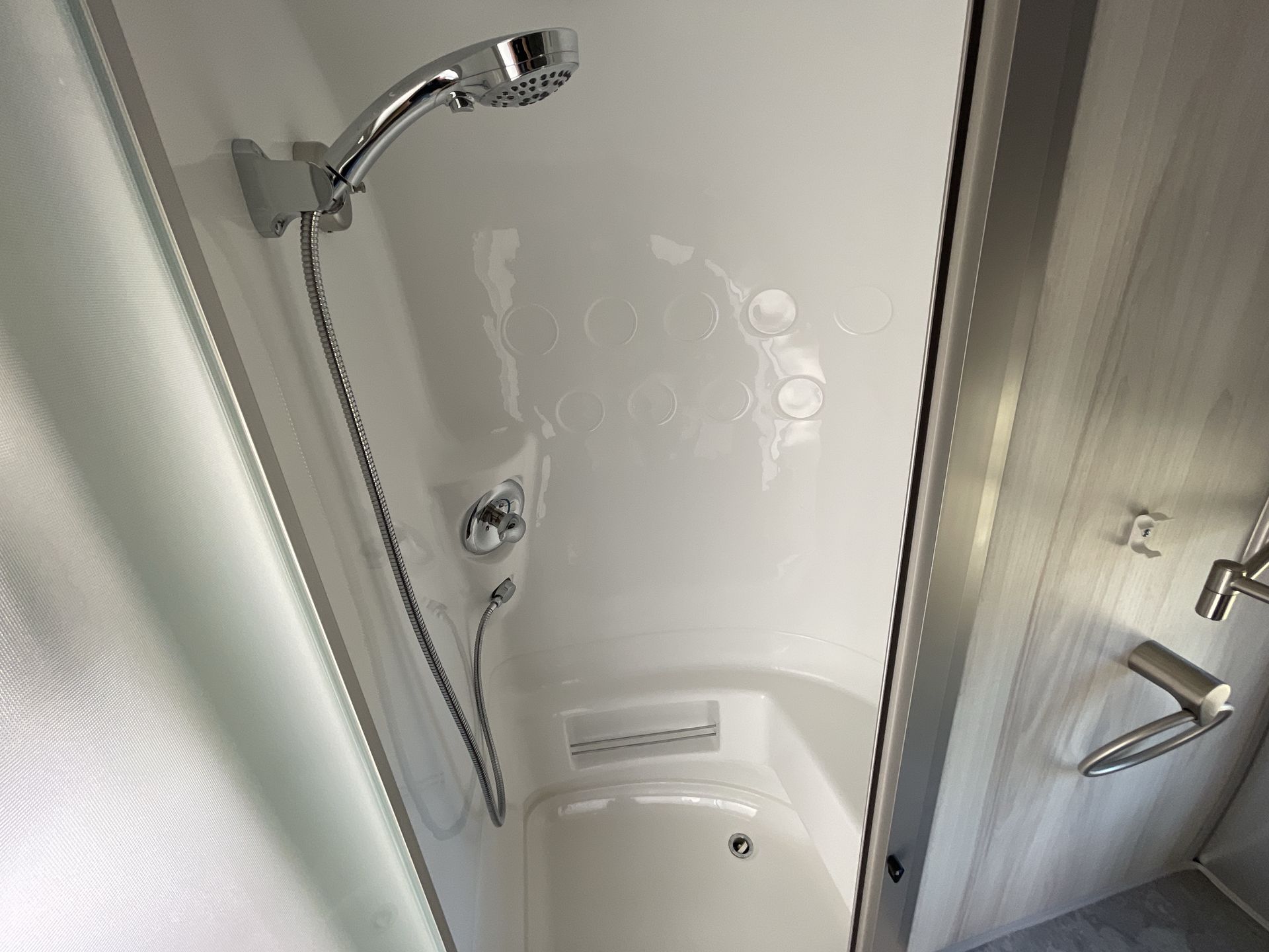 At the rear of the trailer, the bathroom spans the entire width, featuring a spacious shower with a built-in seat, a porcelain toilet, and a vanity with storage. A window provides natural light and ventilation, enhancing the bright and airy feel of the space.
