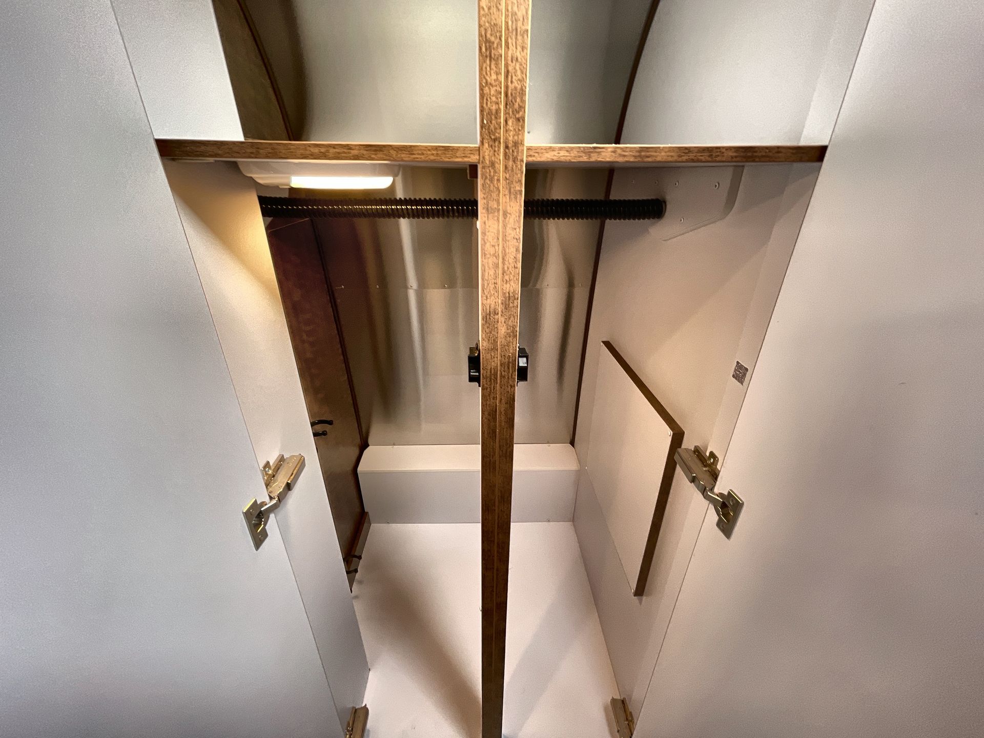 Storage is ample, with carefully designed cabinets and closets to store all your travel necessities securely. The bathroom features a separate shower and toilet area, providing privacy and convenience.