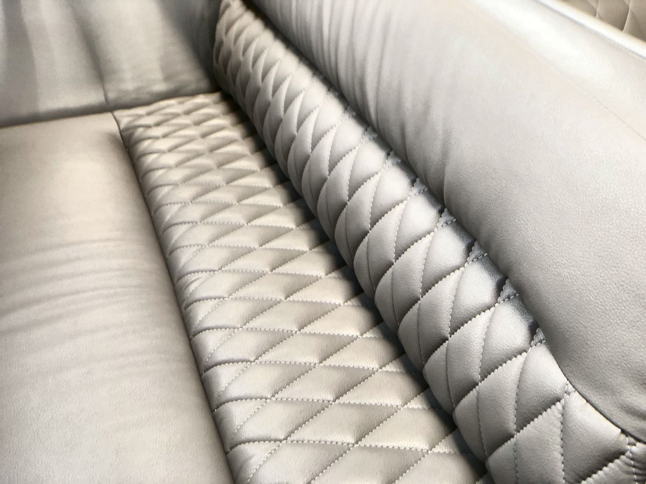 The living area is both functional and elegant, featuring a reclining Ultraleather sofa with two powered seats, perfect for relaxation. The sofa faces a 43-inch smart TV that rises from a media cabinet, creating an ideal space for entertainment. The panoramic windows flood the space with natural light, enhancing the open and airy ambiance. Premium materials, including handcrafted cabinetry and high-quality upholstery, add a touch of luxury throughout the interior.