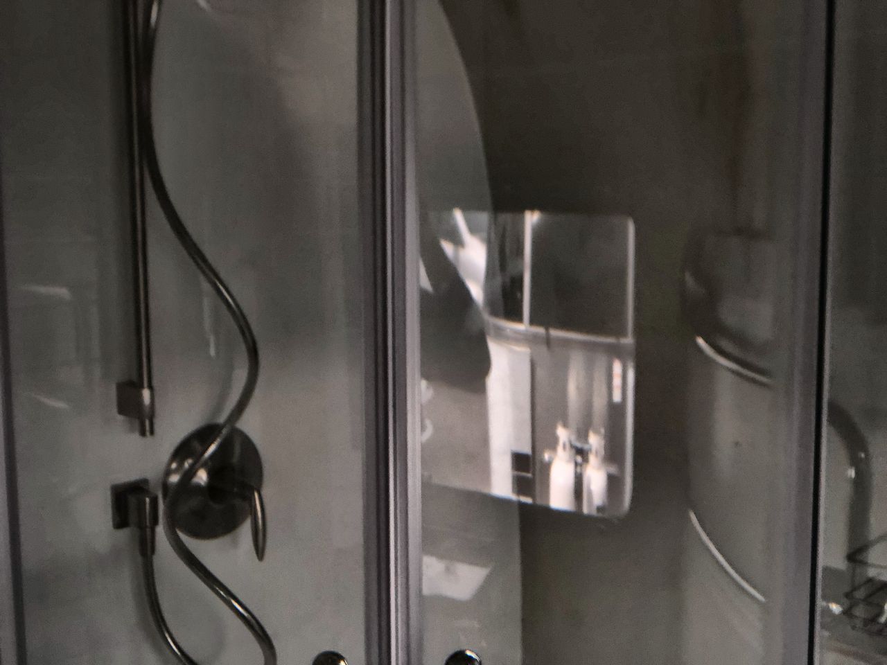 The spacious rear bathroom spans the entire width of the trailer and includes a large vanity, medicine cabinet, heated towel bar, and a residential-style shower with a heated floor, adding to the convenience and comfort during your travels.